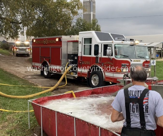 October 3, 2021 – Town of Jackson, WI – An aerial ladder pours a steady stream of water on a machinery shed already heavily damaged by fire.