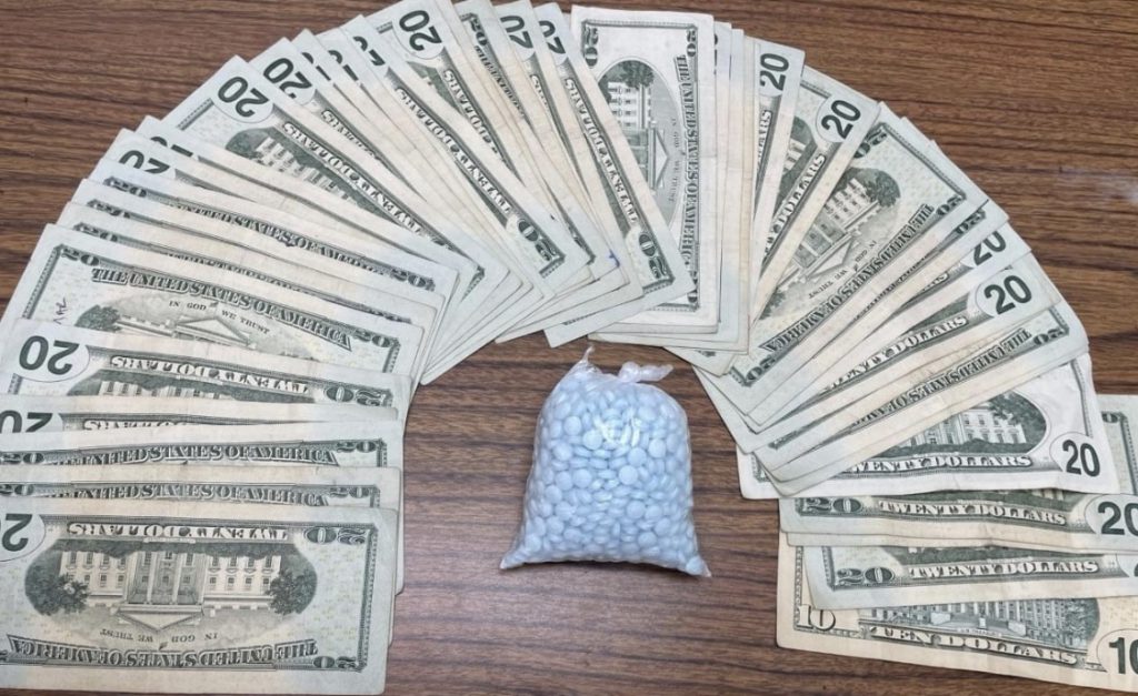 Inside the vehicle deputies located packaging material, suspected MDMA, and cash. Deputies searched the area where the suspect was observed running and located a bag of approximately 1,000 fake oxycodone pills. The pills are believed to be pressed fentanyl pills as the pills field tested positive for fentanyl.