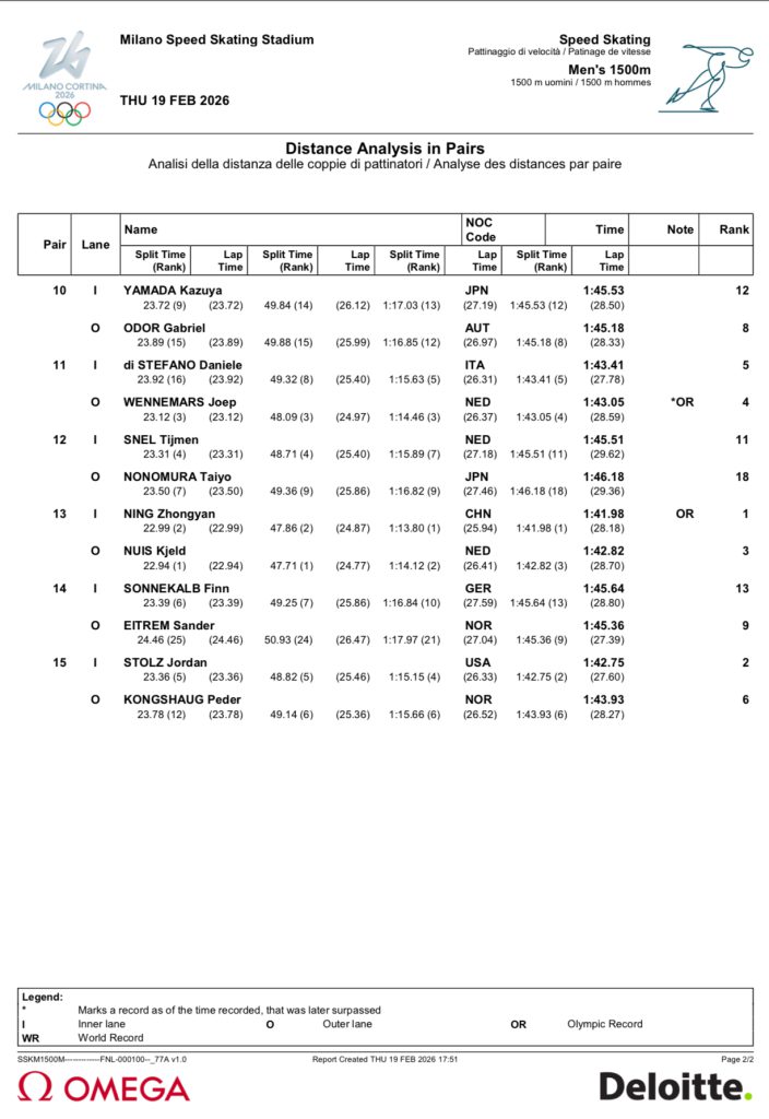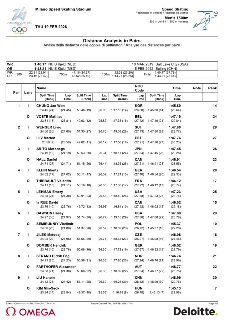 Analysis: Another of Stolz’s top races. His PR is 1:40.480 set in November 2025 in Salt Lake City. Stolz was 5 for 5 in 1st place finishes this season in Salt Lake City, Calgary, Heerenveen, Hamar, and Inzell, Germany.