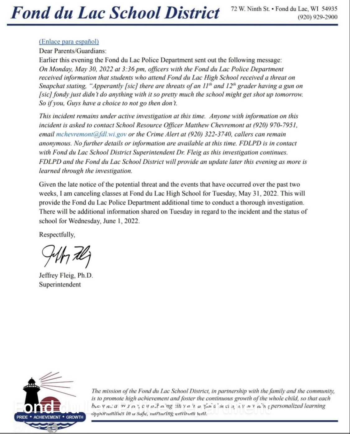 No further details or information are available at this time. FDLPD is in contact with Fond du Lac School District Superintendent Dr. Fleig as this investigation continues.