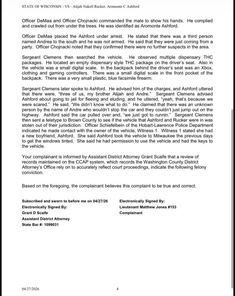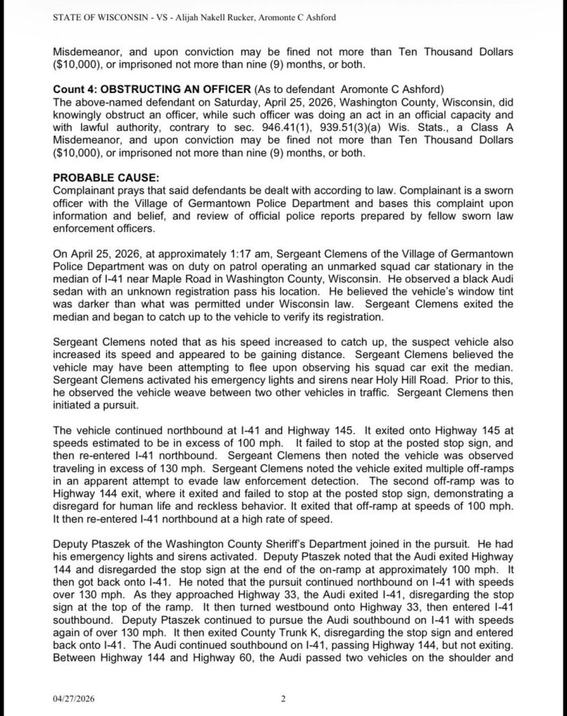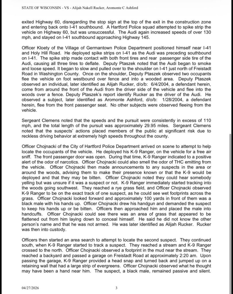 At approximately 1:17 a.m., a Germantown Police Sergeant attempted to stop a vehicle for an equipment violation on I-41. The vehicle fled, initiating a pursuit that reached speeds exceeding 100 mph and extended nearly 30 miles through Washington County.
