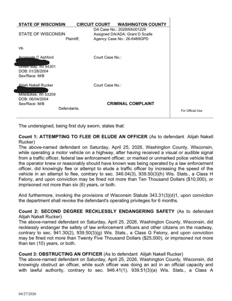 Two 21-year-old men—one from Milwaukee and one from Green Bay—have been referred for charges including:
