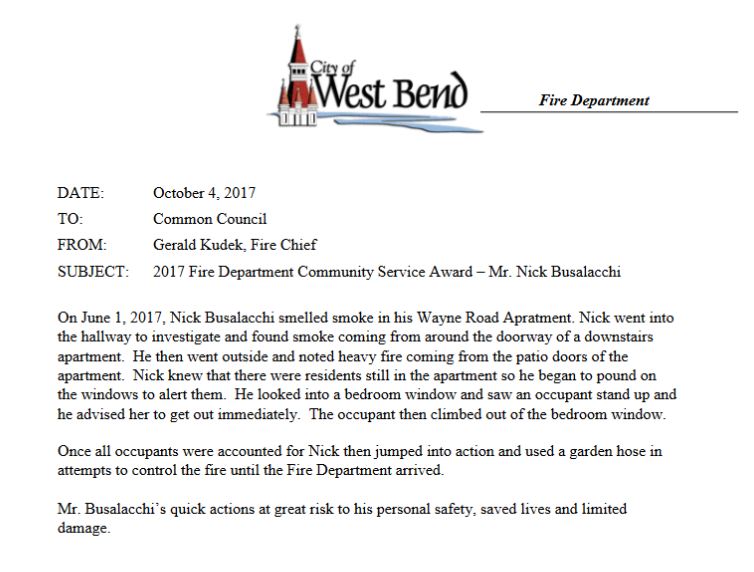 Oct. 17, 2017 – West Bend, WI – An awesome honor for Nick Busalacchi of West Bend who was recognized for helping save people following an apartment fire at the Wayne Road Apartments.
