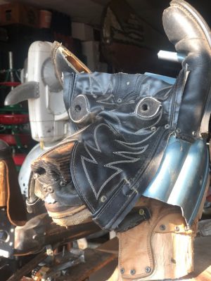 His pieces include discarded farm implements, old cowboy boots, and home appliances.