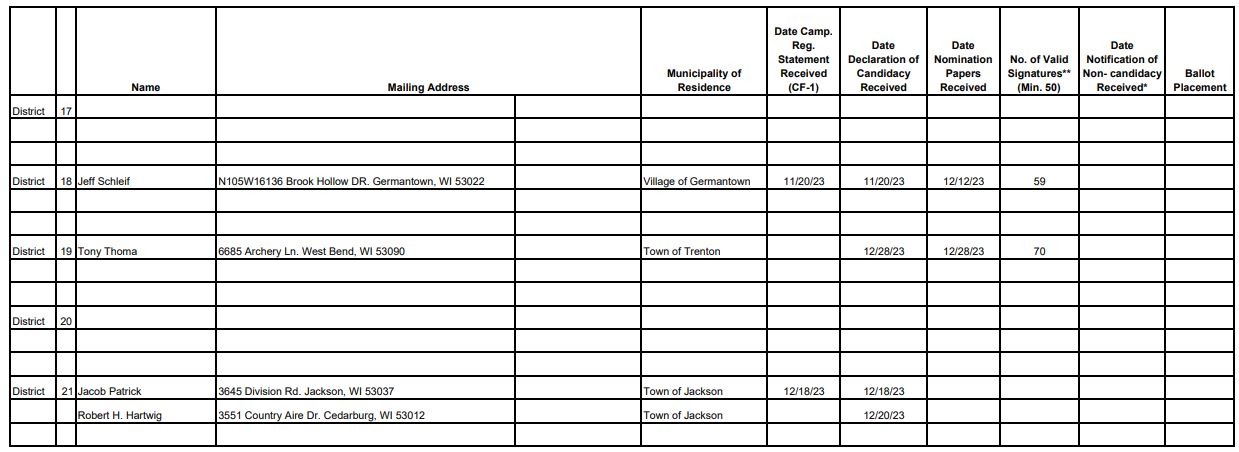 January 2, 2024 – Washington Co., Wi – Today is the deadline to turn in paperwork for the April 2024 Spring Election. All the Washington County Supervisor seats are up for election, and in District 7 the Town of Kewaskum clerk Anne Trautner has filed to run for the open seat.