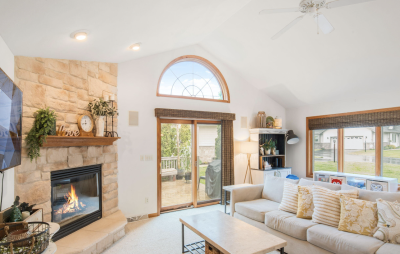The beautifully designed kitchen opens seamlessly into the family room, where a cozy fireplace creates the perfect spot to relax on a cool Wisconsin day.