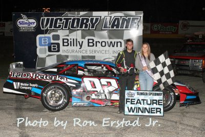 Tom Elsinger won the 25-lap Slinger Bees feature over Ricky Gebhard and Misty Benn. Marty Tackes finished fourth and Brandon Tackes was fifth. Roman Blank and Brandon Tackes were the winners of the Slinger bees heat races and Jason Clope was the fastest qualifier with a lap time of 15.216 seconds.