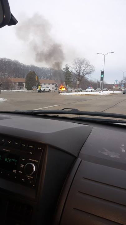 Dec. 23, 2016 – West Bend, WI – A tough way to begin a Friday morning as a motorist’s car starts on fire on Highway 33 just east of the Highway 45 on ramp. Photos courtesy Michelle Studzinski and Jack Neigbauer