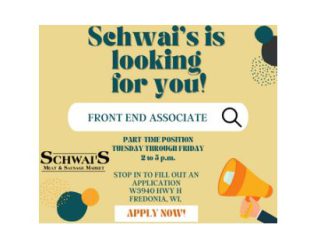 Fredonia, WI - Schwai's Meat and Sausage, W3940 Hwy. H, Fredonia, WI, is looking for a part-time front-end associate. Hours are Tuesday through Friday,...