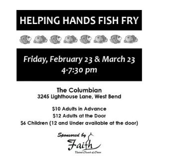 West Bend, WI - Come join us for the Helping Hands Fish Fry on Friday, Feb. 23 at The Columbian, 3245 Lighthouse Lane in...