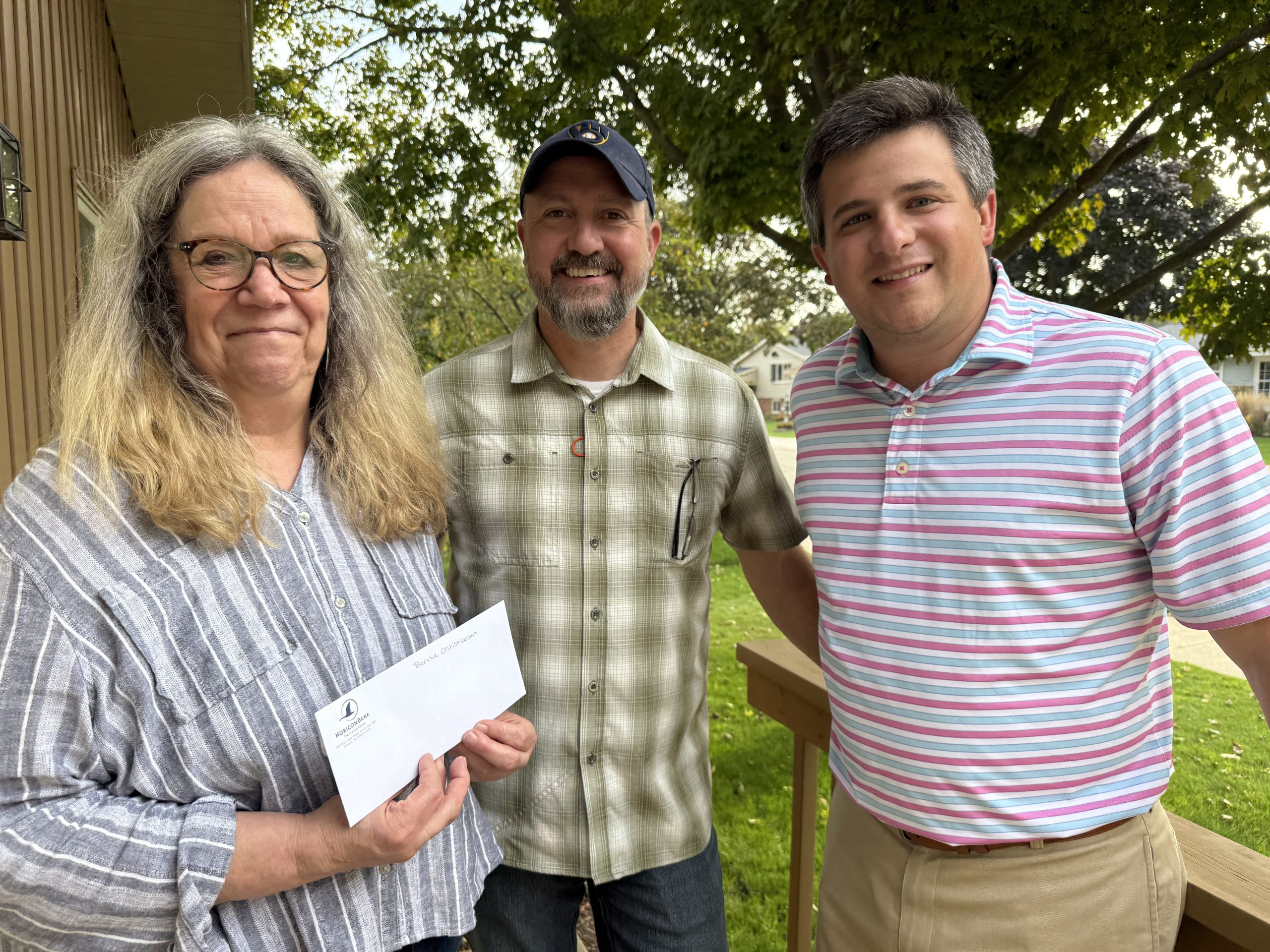 September 30, 2025 – West Bend, Wi – The team of Riley and Ashley Hansen and Chris and Jenni Thompson presented checks to eight families on 16th Avenue in West Bend, Wi, who suffered hundreds of thousands of dollars in damage following heavy rains and flooding in August. A benefit was organized and as you can see… the community was generous to help neighbors get back on their feet.