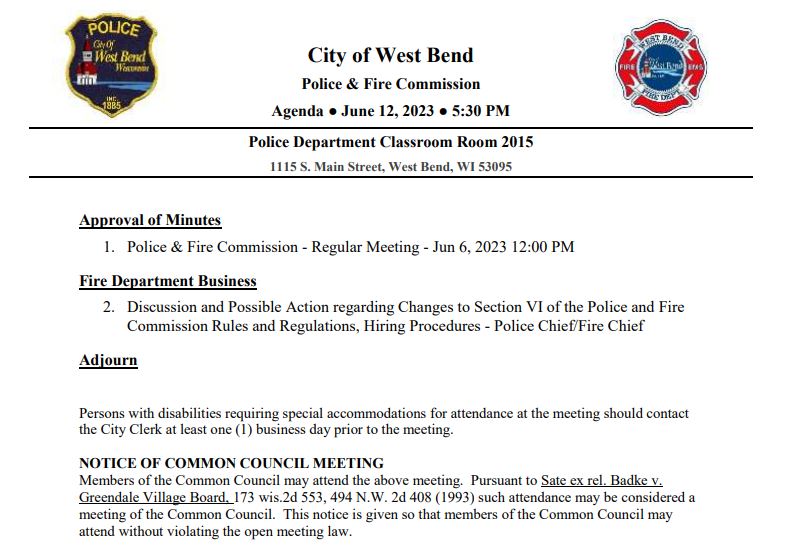 West Bend, WI – The West Bend Police and Fire Commission meet Tuesday, June 12, 2023, to take possible action regarding “Hiring Procedures for a new Fire Chief.”