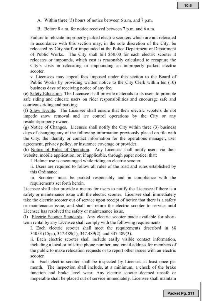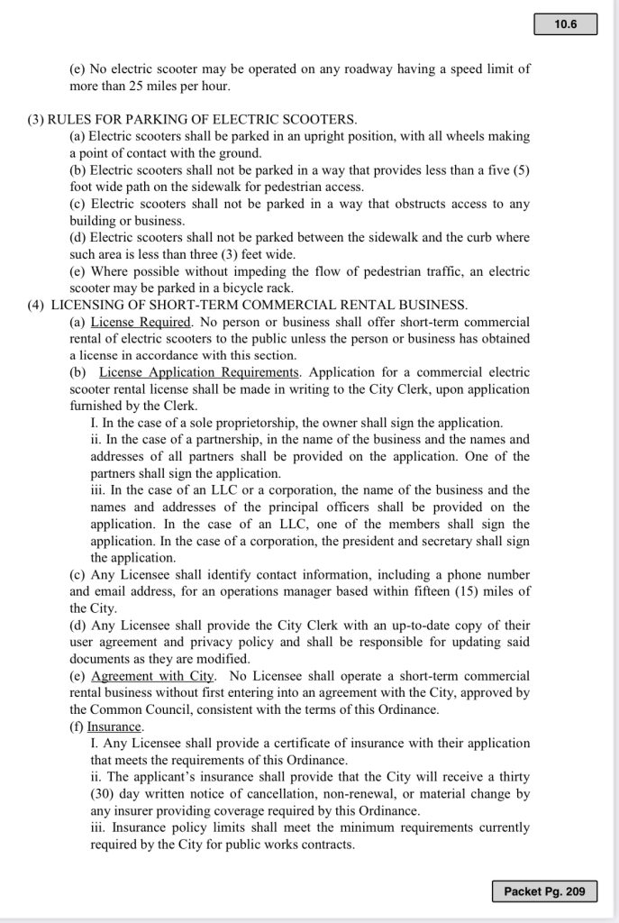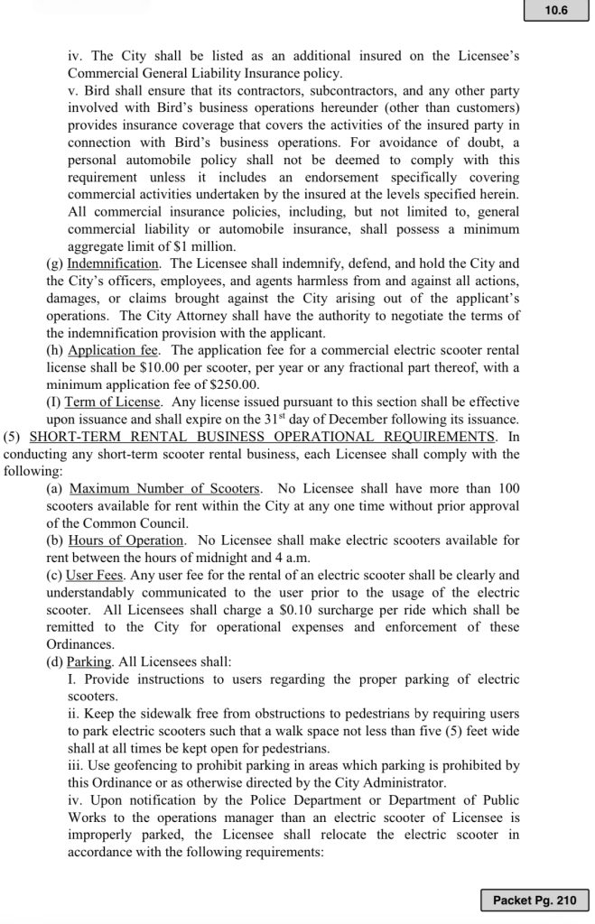 The rest of the agenda item details “health and safety,” among other things, as commercial licenses for electronic scooter rental and an application fee of $10 for each scooter, a .10-cent surcharge per ride that shall be remitted to the City for operational expenses and enforcement of the ordinance.
