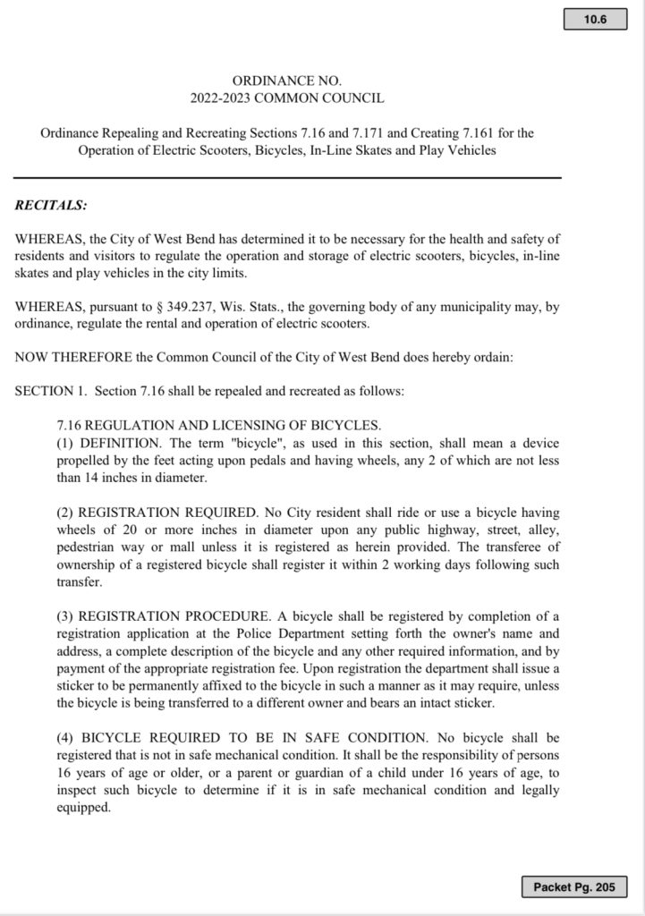UPDATE: One note, the ordinance regarding $10 bicycle license and registration has been longstanding in the City of West Bend, WI. That portion of the proposal, is nothing new according to Dist. 5 alderman Jed Dolnick.