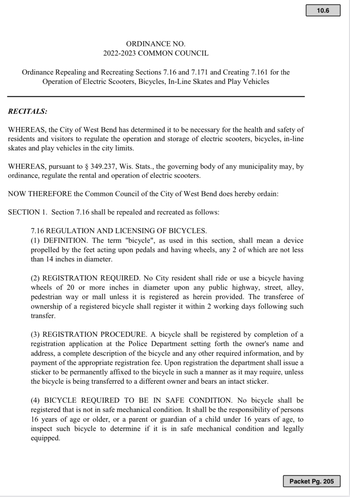UPDATE: One note, the ordinance regarding $10 bicycle license and registration has been longstanding in the City of West Bend, WI. That portion of the proposal, is nothing new according to Dist. 5 alderman Jed Dolnick.