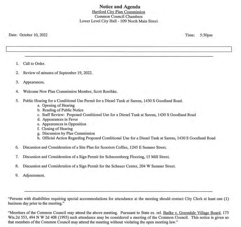 Other items on the agenda include a conditional use permit for a diesel tank on Goodland Road, welcoming of new plan commission member Scott Roethke, and consideration of a pair of sign permits. The full agenda is below.