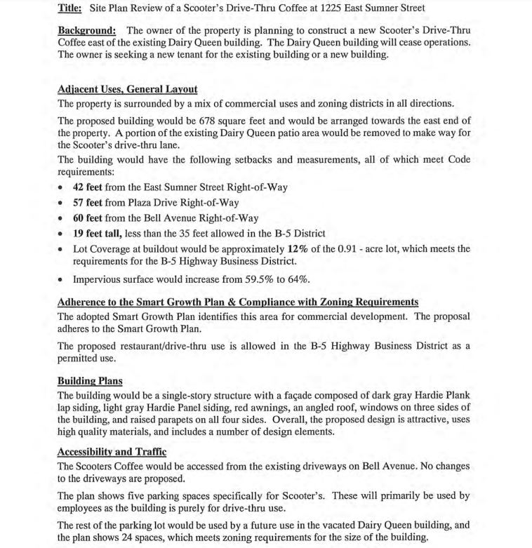 According to the executive summary the property owner wants to build a new Scooter’s Drive-Thru Coffee east of the existing DQ which would cease operations as the owner looks for a new tenant or a new building.