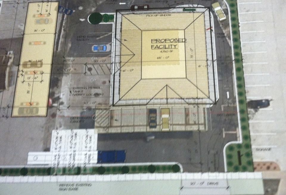 Plans for the gas station and convenience store call for reconfiguring the lot, razing the building, replacing the existing canopy and pumps, building a new convenience store and drive-thru and adding a total of 29 parking stalls. The former Clothes Clinic will also be razed.