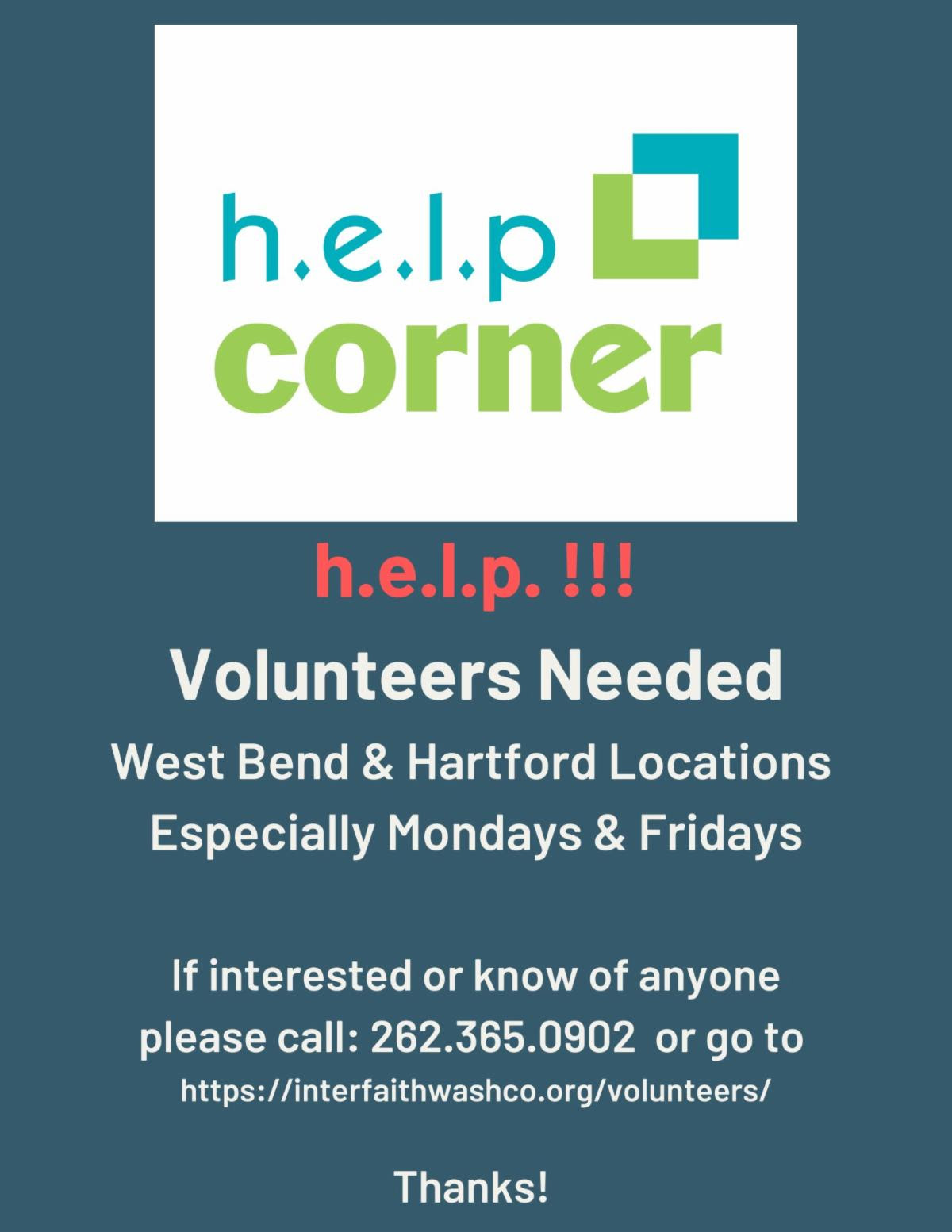 h.e.l.p. Corner urgently needs volunteers at both West Bend, Hartford locations