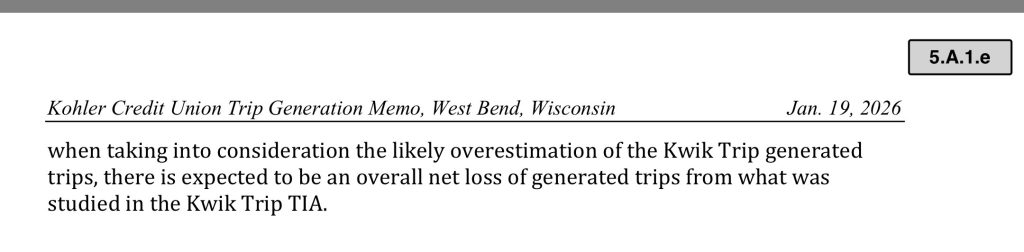 According to the Plan Commission agenda, there will be a review of “a technical memorandum to compare the trip generation of the original land uses as analyzed in the Kwik Trip Traffic Impact Analysis, dated September 11, 2029, and the updated credit union and assumed restaurant land uses.
