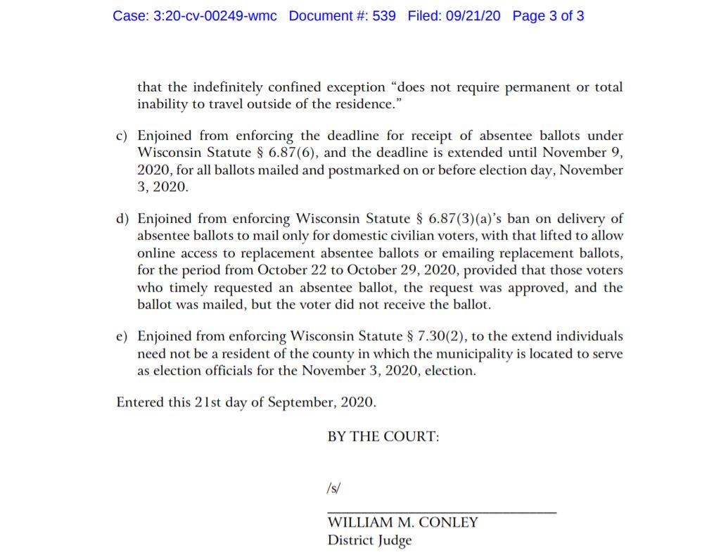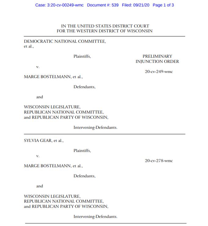 This afternoon U.S. District Court Judge William M. Conley issued a preliminary injunction, opinion and order and in case known as Democratic National Committee, et al. v. Marge Bostelmann, et al. (Wisconsin Elections Commission).  This is a continuation of the case from the April 3 Spring Election that went up to the U.S. Supreme Court.