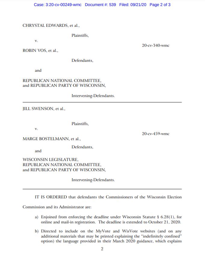 The most important thing for you to know immediately is that Judge Conley has stayed his order for seven days to provide defendants the opportunity to seek an emergency appeal.  The WEC is not the only defendant in the case. The Wisconsin Legislature, Republican National Committee, and Republican Party Of Wisconsin are intervening defendants, and have the right to appeal.