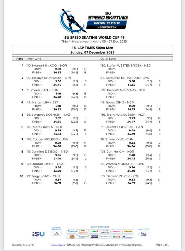 On the sprint side, Stolz once again demonstrated why he is one of the world’s premier 500m talents. Though he insisted he wasn’t at peak freshness — “My legs were a little tired” — everything clicked the moment he stepped onto the ice.