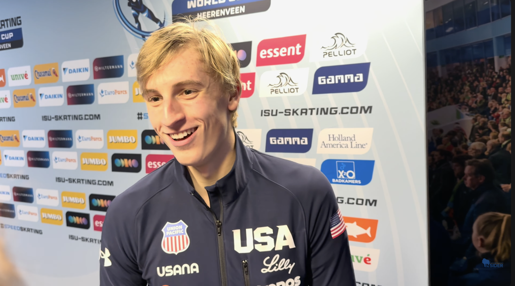 December 7, 2025 – Heerenveen, Netherlands – On the heels of two races and two new track records at the Thialf in Heerenveen, Netherlands, Jordan Stolz laces up for his final two races of the weekend with the 500 meter and the mass start.