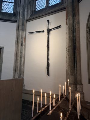 According to Edwin, a docent, “In the 16th century when there was a struggle between the Protestants and the Catholics in the Netherlands. The Protestants made an effort to get rid of idolatry, saying the images of people were actually idols and you shouldn’t worship a sculpture, you should worship God only. That’s why they smashed all the statues and paintings. Since the sculpture above was part of the wall and couldn’t be removed they decided to smash off the faces.” The pattern was repeated throughout the church.