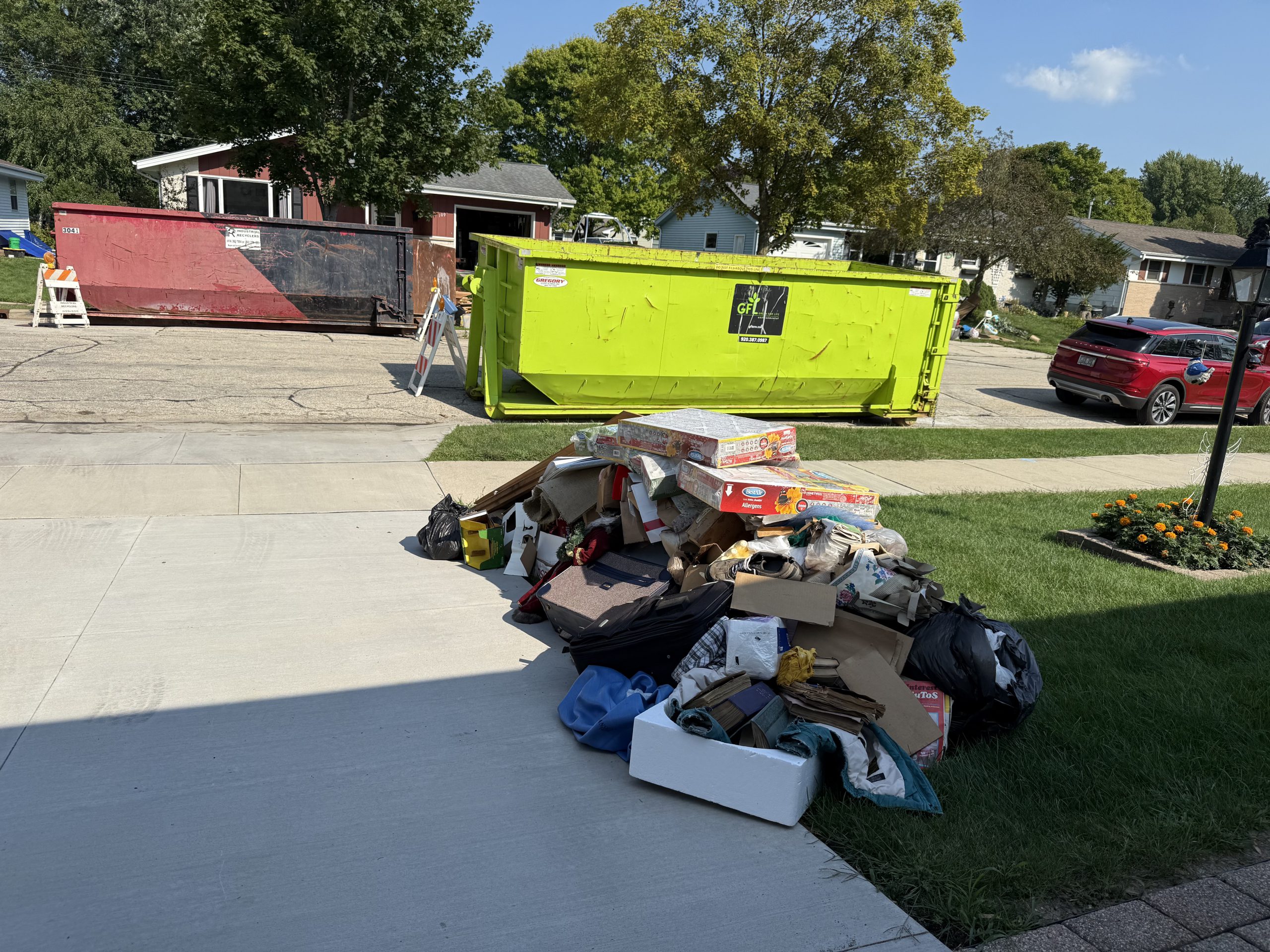 August 17, 2025 – West Bend, Wi – Dumpsters line 16th Avenue near Walnut Street in West Bend, Wi, as neighbors make repeated trips from flooded basements carrying destroyed remnants of their lives. “The sewage came up quickly,” said one neighbor. “My basement wall collapsed, and I barely got out with my baby,” said another.