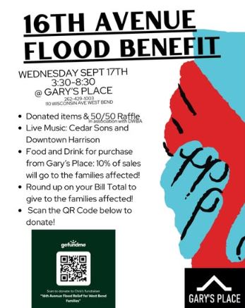 West Bend, Wi – The West Bend community is uniting for the 16th Avenue Flood Relief Benefit to raise funds for families whose homes were severely damaged by record-breaking floods. The event is on Wednesday, September 17, 2025, from 3:30 p.m. to 8:30 p.m. on the back patio at Gary’s Place, 110 Wisconsin Ave., West Bend, WI. This benefit supports the Bettin, Christiansen, Damschen, Fellenz, Hanrahan, Jarr, Sabo-Gripentrog, and Wendt families, who suffered significant losses from the devastating floods on August 9, 2025. All proceeds will directly aid these families in rebuilding their lives.