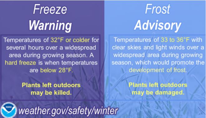 “Frost could kill sensitive outdoor vegetation if left uncovered. Take steps now to protect tender plants from the cold,” according to the National Weather Service.