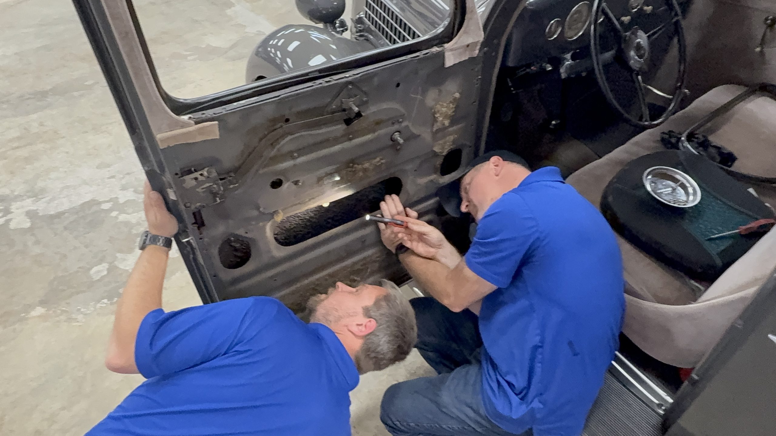 “It’s neat to see how they engineered these things back then,” Uelmen said. “Today’s cars have stationary glass glued in place. This one cranks open first, then drops down. Makes for an interesting fit.”