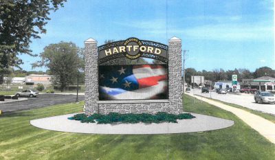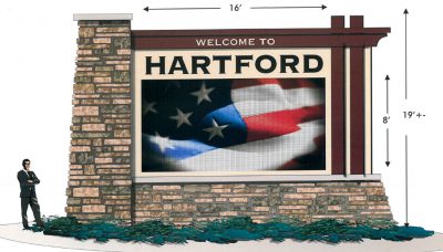 The electronic message center would be 79 square feet and would be framed by a decorative stone base and columns as well as an arched metal scrollwork “Welcome to Hartford” framing the top of the sign.