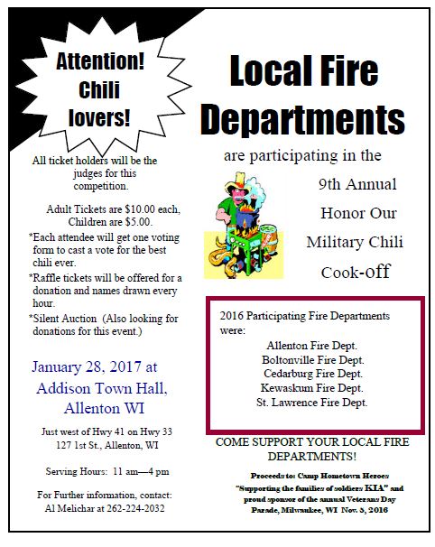 Jan. 28, 2017 – Allenton, WI – Stop by Addison Town Hall from 11 a.m. – 4 p.m. to take part in the 9th annual Honor our Military Chili Cook-off.