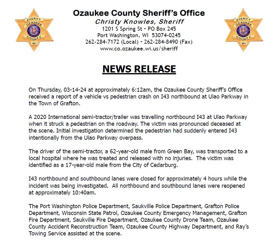 March 14, 2024 – Ozaukee Co., WI – The Ozaukee County Sheriff has issued a statement regarding the closure of a portion of I-43 on Thursday, March 14, 2024.