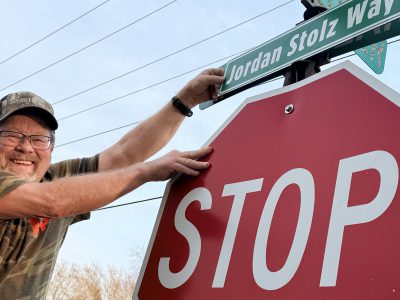 March 25, 2026 – Town of Wayne, Wi – As 3-time Olympic medalist Jordan Stolz gets ready to throw out the first pitch at the Brewers home opener on Thursday, ideas guy Chucker Dreher is figuring another way to honor the hometown hero. Dreher crafted a street sign – Jordan Stolz Way. On Wednesday afternoon he gave it a test run…
