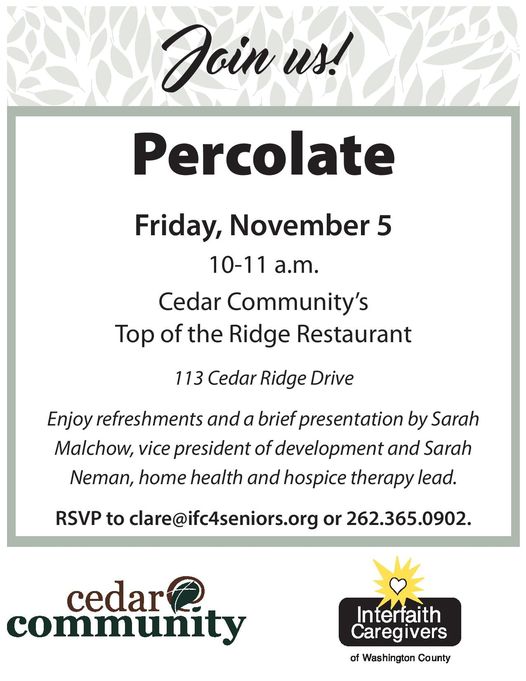 West Bend, Wi – The November Percolate for Interfaith Caregivers of Washington County is on the road to Cedar Community.