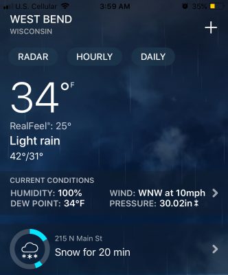 Oct. 15, 2018 – West Bend, WI – At 4 a.m. Monday and it’s snowing in West Bend.