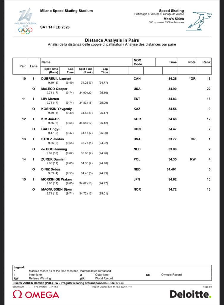 In a post-race press conference, Stolz was quoted by ISU regarding his final turn, “I thought, when I (would) come out of the exit, if we were right next to each other or even if he was a little bit ahead, I thought I would still be able to win, just because my last hundred is really good, but I skated a really good race. That last outer was perfect, so he didn’t catch up to me.”