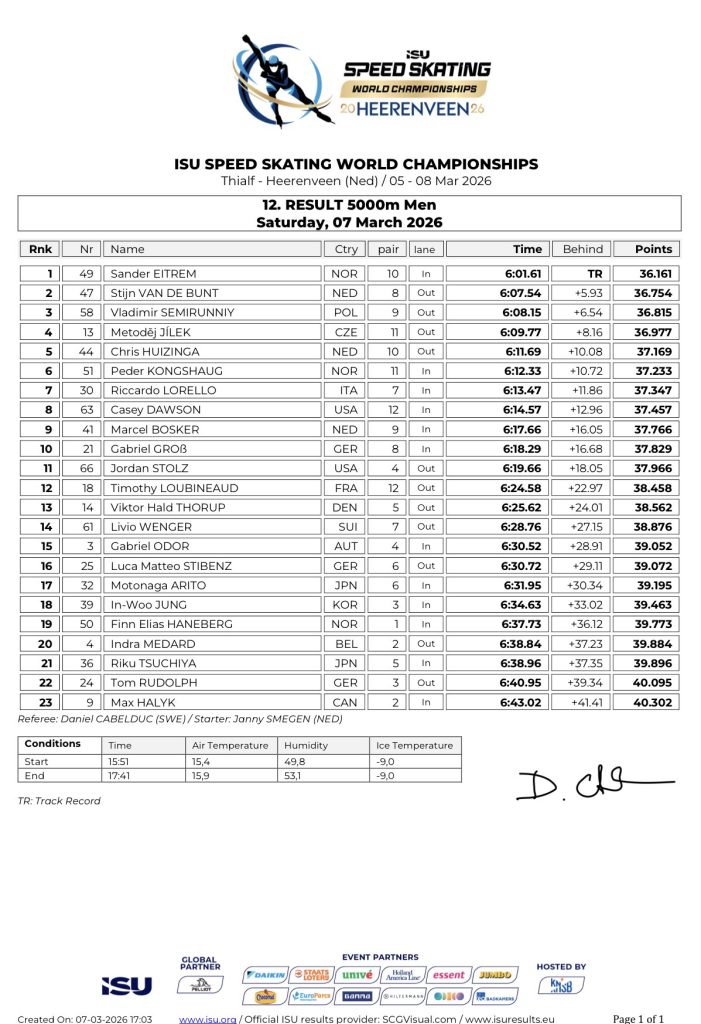 -The start list for the 1500m has Stolz skating last, in the 12th pairing vs. Sander Eitrem of Norway. The 24-year-old Eitrem finished first in the 5000m with a time of 6:01.61. His personal best in the 1500m was skated December 9, 2022 at 1:43.230.