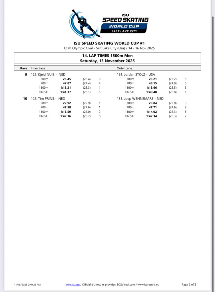 On Saturday, December 6, 2025 – Stolz will skate the 1000m and Sunday he skates the mass start followed by the 500m.