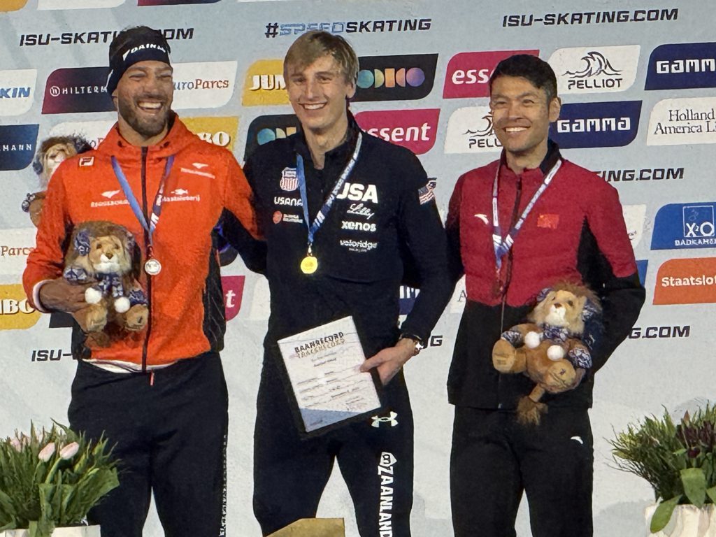 December 5, 2025 – Heerenveen, Netherlands –  What a way to start the weekend in Heerenveen. Town of Wayne speedskater Jordan Stolz opened the third ISU World Cup of the season with a jolt of electricity Friday night, setting a new 1500 meter track record at Thialf and capturing gold in front of a roaring Dutch crowd that treated him like one of their own.