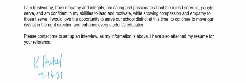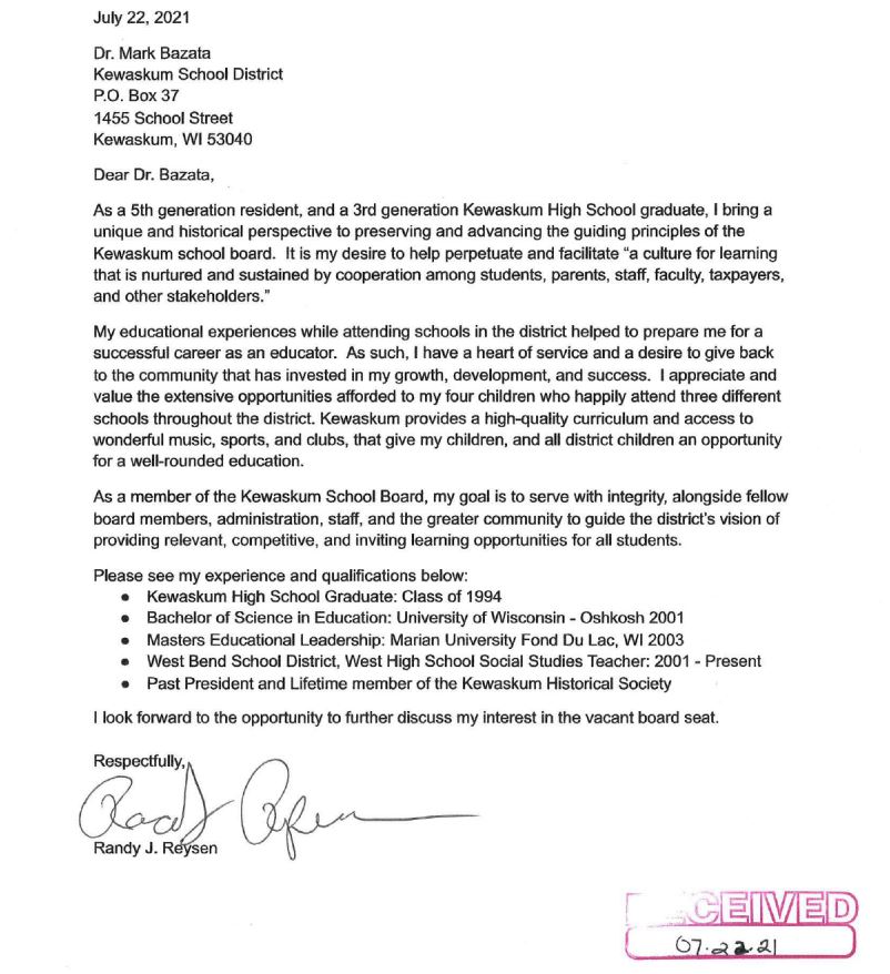 Please receive the following letter as my formal notice of interest in the vacancy on the Kewaskum school board.
