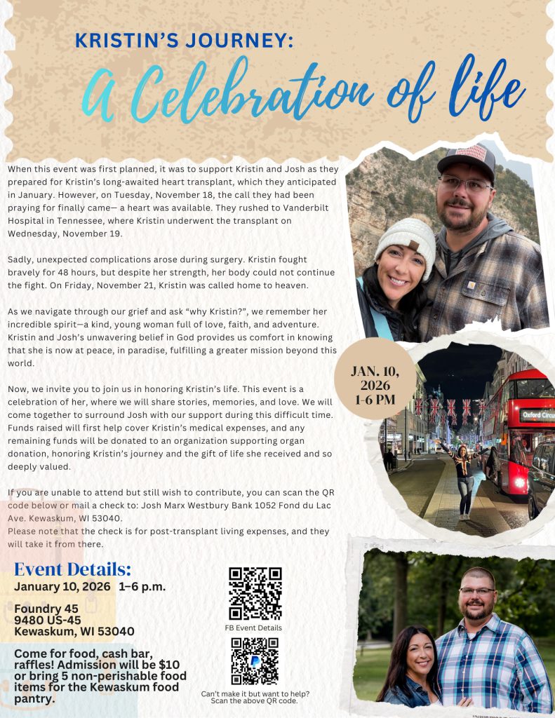 Kewaskum, Wi – A Celebration of Life event is Saturday, January 10, 2026, in Kewaskum for Kristin Marx. Friends and neighbors are welcome to share stories and camraderie and honor Kristin’s journey. Details are below.