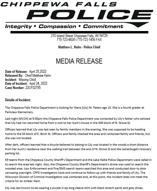 April 25, 2022 – Chippewa Falls, WI – The Chippewa Falls Police Department (CFPD) is searching for 10-year-old Iliana (Lily) M. Peters, who was reported missing Sunday night, April 24, 2022. Iliana (Lily) Peters was last seen wearing a purple 1/4 zip long-sleeve shirt, black stretch pants, and gray shoes.