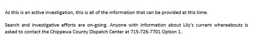 Anyone with information should contact the Chippewa County Dispatch Center at 715-726-7701, Option 1.