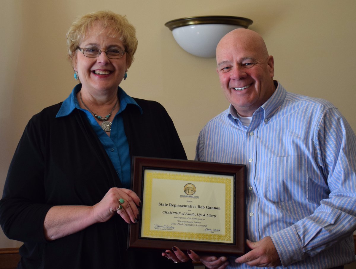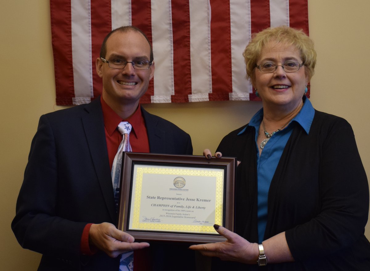 Today, Rep. Jesse Kremer (R-Kewaskum) and Rep. Bob Gannon (R-West Bend) received a “Champion of Family, Life and Liberty” award from Julaine Appling, president of Wisconsin Family Action (WFA). Appling made the rounds at the State Capitol today delivering the awards to those legislators that received a 100% score on the WFA Legislative Scorecard.
