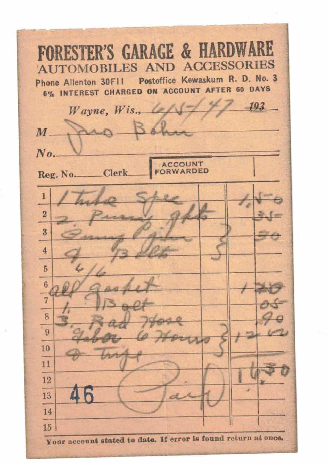 When the tractor needed service, we didn’t have a telephone, so Dad would drive to G.W. Forester Garage in Wayne, Wisconsin, a small burg about 5 or 6 miles northwest of West Bend. Dad would take us along to give Mom a break. To go with Dad was a big thing for us kids.
