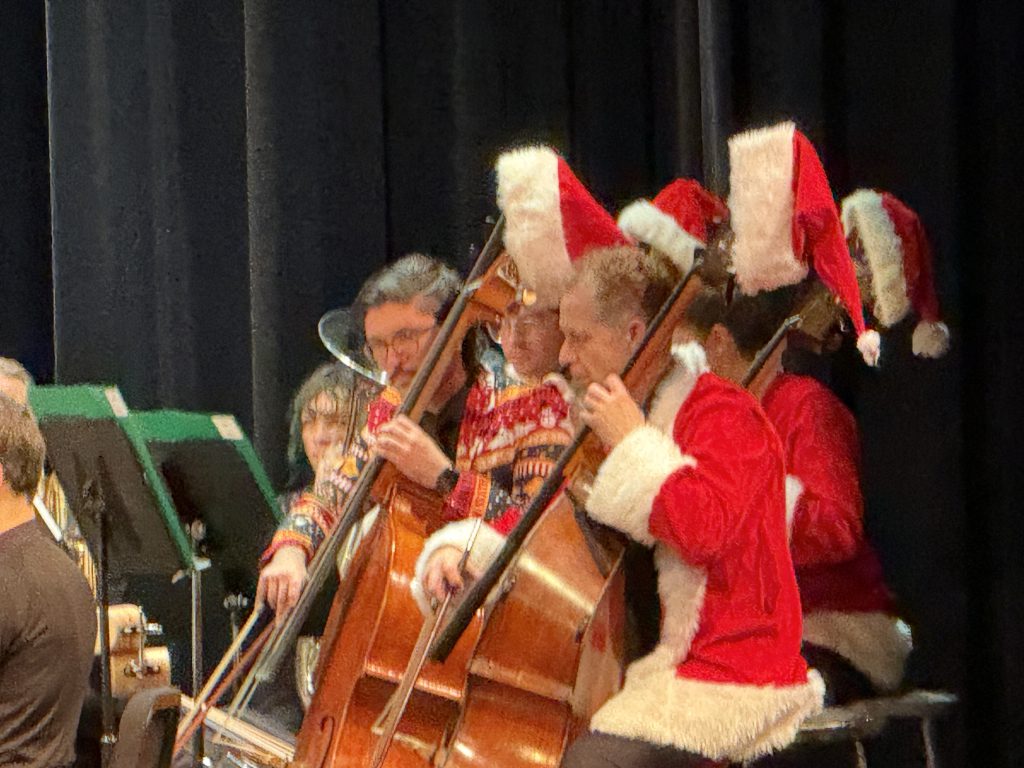 The orchestra was festive as well as they offset their formal black with a splash of tiny Santa hats on their instrument’s pegbox, or some members wore decorative headbands… while the bass section all came dressed in full-on Santa suits.
